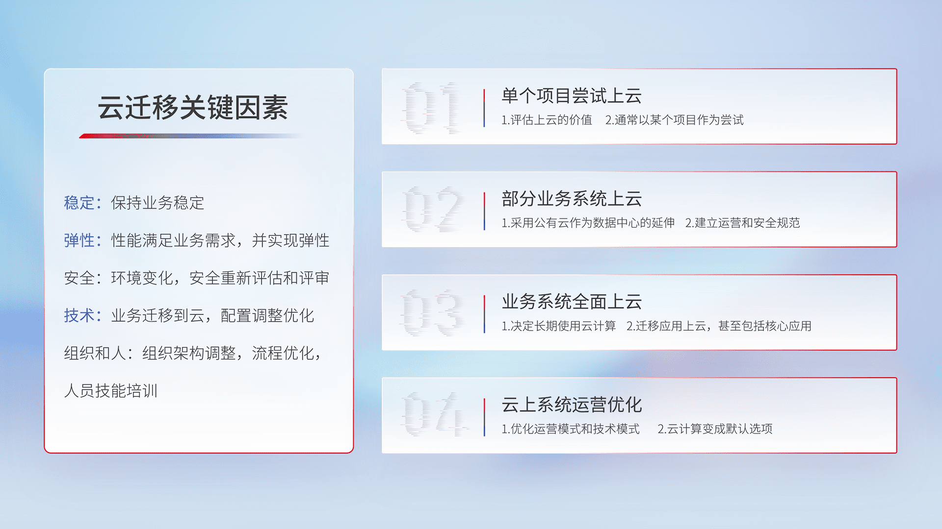 结合实际业务,,从规划设计、、云平台选型、、、云原生改造、、、、数据迁移、、集成交付,,迁移全过程为客户识别最佳上云路径,,,,做好风险识别管理,,设计网络架构、、、身份权限、、、、安全审计合规、、、、操作审计、、、日志审计、、监控告警策略、、多站点容灾设计等,,,,对云上基础设施进行整体规划,,提升IT治理水平,,,,以满足弹性、、、、高可用、、、、高性能的需求。。。