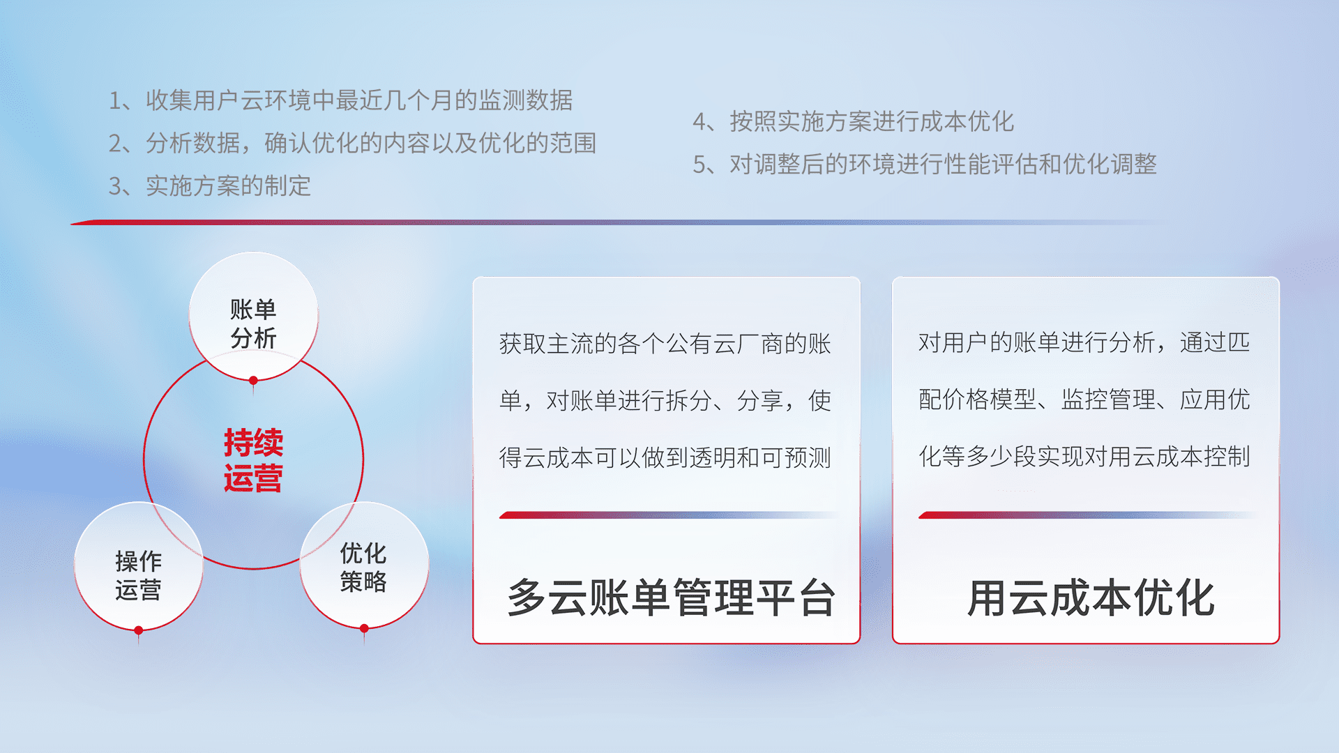 通过多云纳管,,,,以统一的资源数据模型把客户的云资源进行抽象和封装,,进而实现对多云资源的统一操作,,保障云资源管理的可靠性、、、稳定性与可用性。。量身定制化运维内容,,,,配置、、、开发运维、、补丁管理、、、、备份、、监控、、、认证和访问管理、、审计和日常巡检等,,,保障在用云过程中的可靠度,,稳定度以及高可用率。。。
